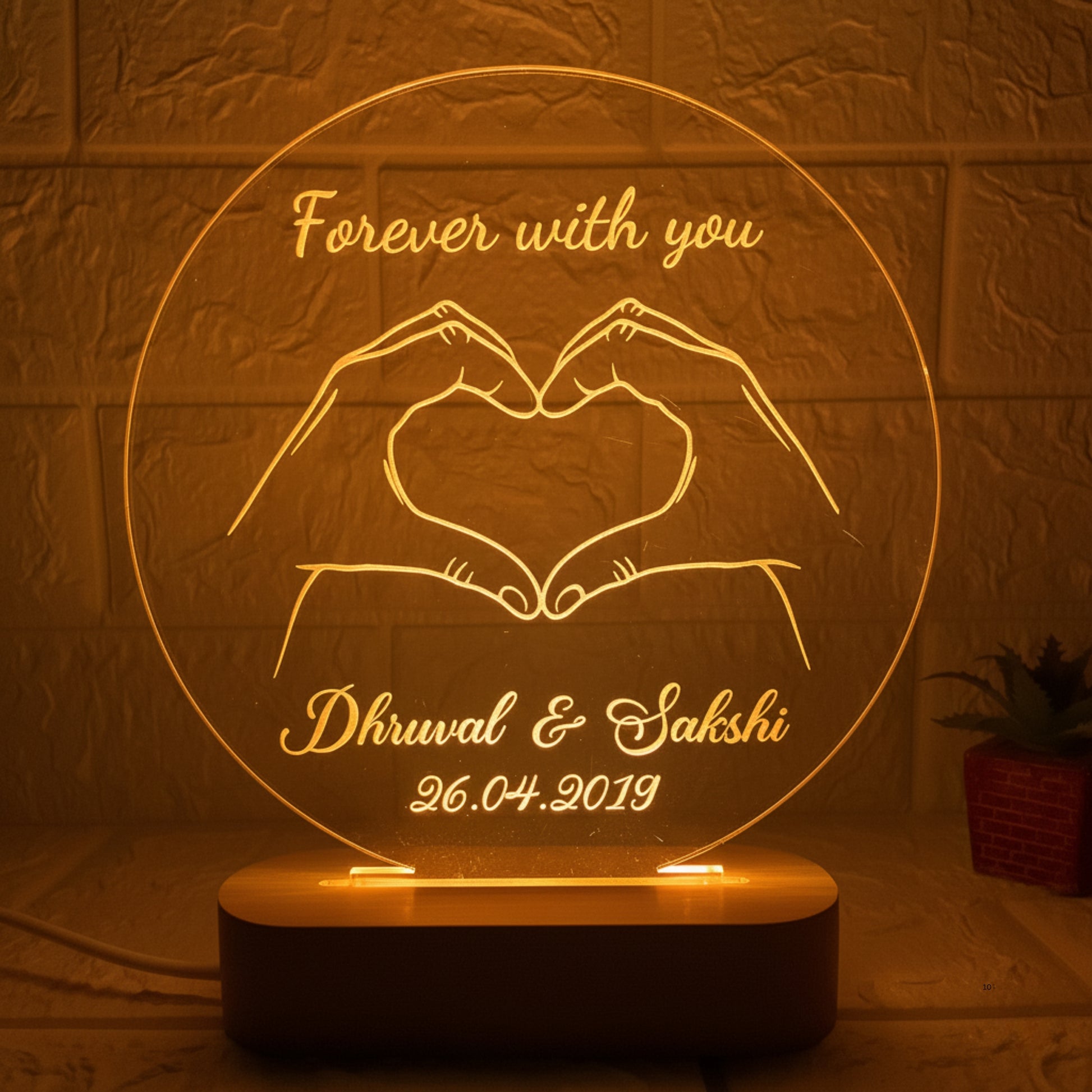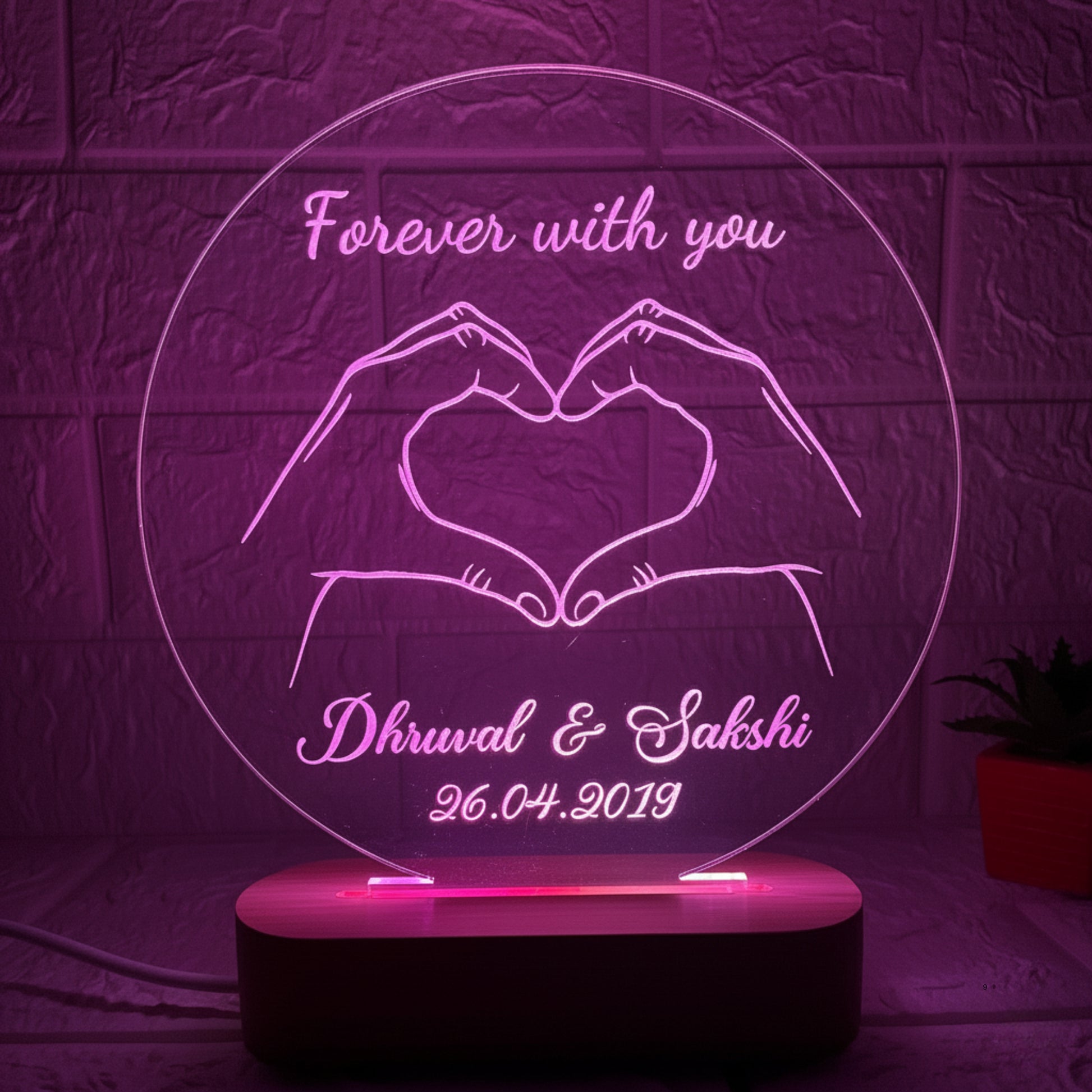 Nexify Fusion Personalised 3D Illusion Round Forever Hand Design Night Lamp. Beautifully crafted, this elegant Lamp features a Round Frame with a Forever Hand design, symbolising faith, unity, and endless togetherness. Add a personal touch with Couple Names and a Special Date or Message, transforming it into a heartfelt keepsake that will be treasured for years. Auto Multicolor Change LED sets a cosy, romantic mood, perfect for bedrooms, side tables, or as a charming highlight in any decor. Made with precision using laser-engraved acrylic and a durable wooden base, this lamp combines style and strength. USB-powered convenience — compatible with laptops, adapters, or power banks — while remaining safe and energy-efficient. Ideal for wedding, Anniversary, birthday, or Valentine’s Day, this personalised lamp is more than a gift — it’s a glowing expression of love that brightens every Space and every heart. With Nexify Fusion, every light tells a story of affection that shines forever.